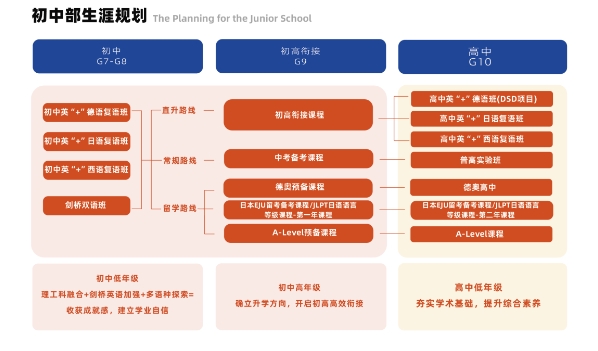 新亚学校初中部开设英德复语班、英日复语班、英西复语班和剑桥双语班,学生可根据自身情况及家庭规划选择直升新亚高中部对应班型、常规路线冲刺中考报考重点高中、留学路线申请德奥高中预备课程/日本EJU留考课程/A-Level课程。新亚学校初中部涵盖国内升学与国际留学,给予学生多元成长路径选择。