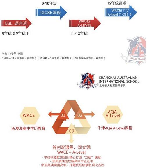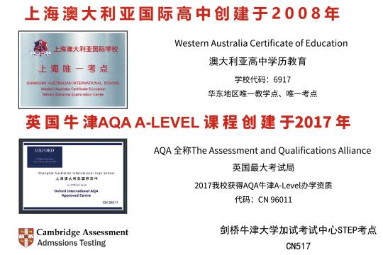 上海澳大利亚国际高中创建于2008年,是华东地区唯一一家由澳大利亚西澳洲教育部授权开设在中国的澳洲海外精英公立高中,也是澳洲高考考试中心。学生毕业后获得由澳洲教育部颁发的高中毕业证书。学校同时提供英国牛津AQA A-LEVEL课程,双课程、双文凭,为学生搭建了一座走进世界名校的桥梁。
