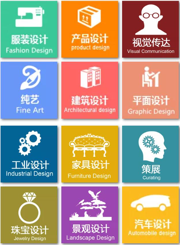 纯艺、平面设计、插画、工业设计、产品设计、珠宝设计、建筑设计、室内设计、服装设计、动漫设计、游戏设计、交互设计、景观设计、汽车设计、家具设计、数字媒体、时尚管理、品牌管理、艺术管理、时尚买手、策展、奢侈品管理、时尚营销、时尚新闻、创意计算机等60多个设计及管理类专业。