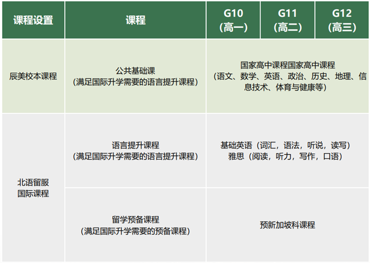 北语留服的语言提升课程,留学预备课程和辰美的公共基础课程,高中双语融合课程、综合类课程(体育、社会实践活动、社团活动等)创造性的课程相互融合。