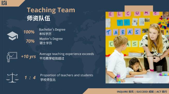 为保证高质量的教学,爱莎天河荟聚了一批来自全球各地富有经验和教育情怀的国际教师和中方教师,具备专业的教育资质且平均教学年龄超10年。作为IB从业者,他们精通探究式教学,并具备高水平的跨文化能力。其中,国际教师分别来自英国、美国、加拿大、澳大利亚、新西兰和爱尔兰等以英文为母语的国家。中文老师和助教老师则是来自本地教育/国际教育系统且精通双语的教育人才。