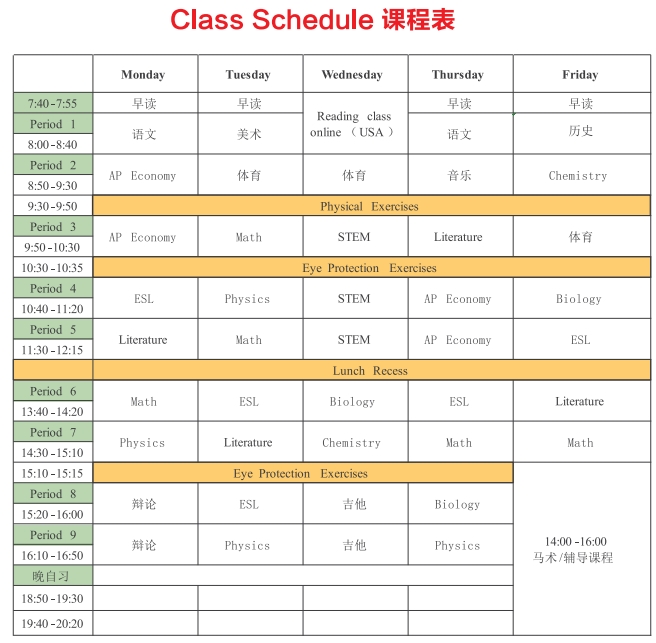 同步美国顶级私立高中课程体系设置,严格打造扎实的学术基础,确保学生可以满足美国名校的学术要求。与此同时将国际赛事,艺术体育、公益活动等课程融入其中,包含:“爱丁堡国际奖”户外探险活动、AMC数学建模大赛,马术课、飞行课、吉他课等,学校拥有三十余社团活动供学生选择。