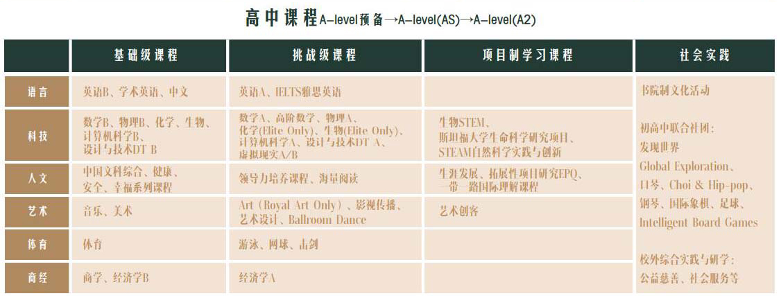 高一(10年级)提供iGCSE课程,旨在为海外(英国以外)的母语非英语的国际学生提供资格考试。高二(11年级)和高三(12年级)提供英国高中课程(General Certificate of Education Advanced Level)简称A-Level课程,它是英国的普通中等教育证书考试高级水平课程,是英国的全民课程体系,也是英国学生的大学入学考试课程。A-Level课程证书被几乎所有英语授课的大学作为招收新生的入学标准,因此,A-Level课程被国际教育界誉为“金牌”教育课程和全球大学入学的“金牌”标准(British Golden Education System)。英国文凭和课程管理局(QCA)负责管理及规范公共考试系统,英国考试局(CIE/Edexcel/AQA)统一负责海外的IG/A-Level考试。这种课程要求学生学习三门或四门主科课程并参加毕业考试,A-Level课程分AS和A2两个阶段的学习,学生在高二(11年级)学习AS课程,高 三(12年级)学习A2课程。A-Level的评分为A、B、C、D、E五等级制,学生的考试成绩及其选修的A-Level课程在很大程度上决定着能否选择理想的大学和学习所选择的学位课程。针对中国学生,申请时还需要提供学校成绩单,推荐信和英语能力证明(一般为雅思成绩)等。
