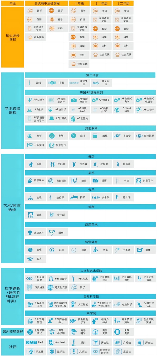 在校内,全校实行走班制,英语教学的分层是打破年级界限的,全校分为A-E五个层级,学生的英语课从此不再按年级分班,而是按层级分班;选修课的分层,则是在同类学科之中,做出了AP和PBL的分层;数学的分层,主要是在课程的内部做了分层,例如数学成绩优异的学生,可以学习微积分先修课程;最后核心课程的分层,体现在物理、化学、生物这三门理科的分层上。