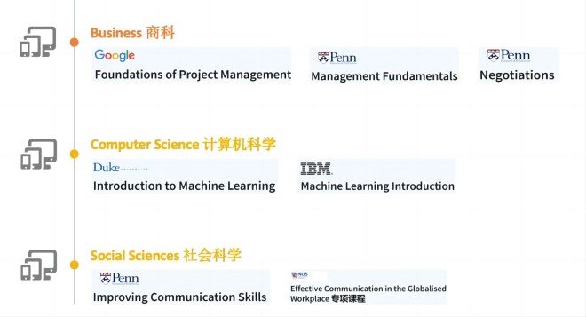 学校为学生提供专业课程的同时,帮助学生在专业课程上学习相关行业课程,并最终取得国际化行业证书。