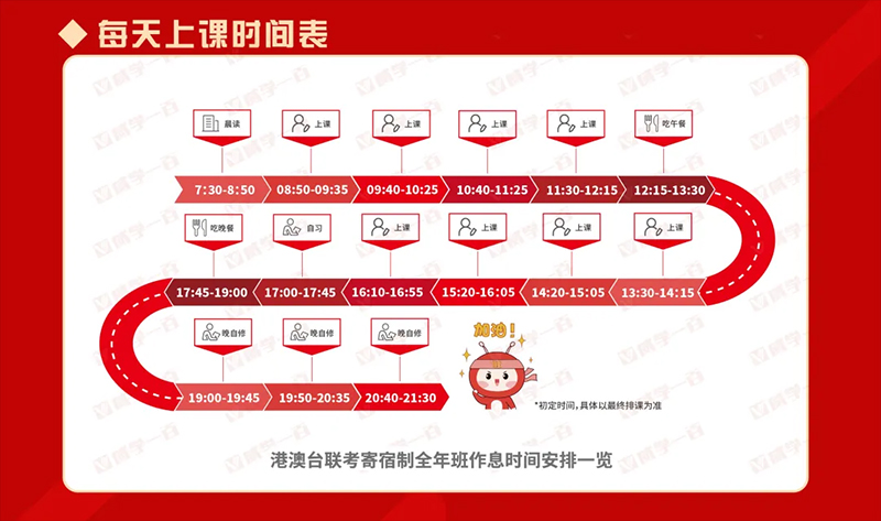港澳台联考寄宿制全年班的学员,每天从早上7点半到晚上9点35,时间都被精心安排得满满当当,确保每个人都能在这宝贵的时间里面,学习到最多的内容。我们有合理的学习计划,科学的课程表,再加上全程的学习服务团队的监督,给学员打造了一个高效有序、充实的封闭集训学习体验!