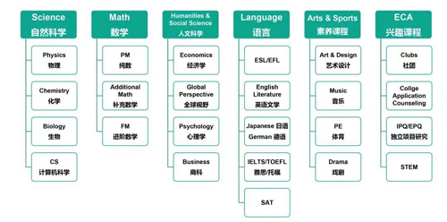 其中包含“自然科学、数学、人文科学、语言、素养课程、兴趣课程”六大模块: