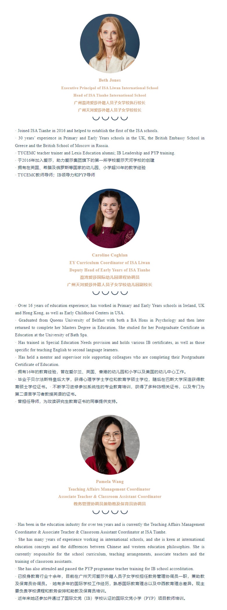 荔湾爱莎国际幼儿园除了中文教师和副班教师,其余教师均为外籍教师。外籍主班教师来自英国、爱尔兰、澳大利亚、新西兰等世界各地,所有教师都拥有国际认可的学位资格、专业的工作经验和国际化思维。