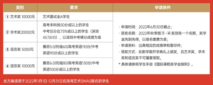 针对艺术、学科或英语优秀的学生,学校提供高达人民币80000元的入学、升学奖学金。