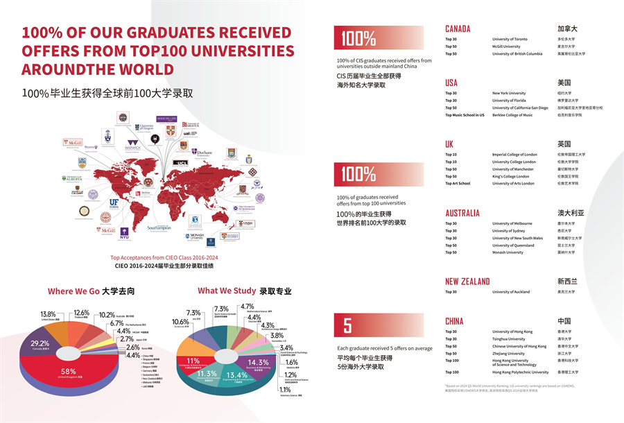 CIS拥有骄人的毕业生记录,根据2024年数据,CIS100%高中毕业生升读至全球TOP100大学,其中73%升读至TOP50、58%升读至TOP30。