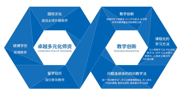 按照师生1:4 标准配备教师,同时师资队伍均是由具有5-10年以上教学经验的骨干教师以及拥有海外留学及执教经历的青年优秀教师组成。学校共有60+教师人数 ,其中90%人员为硕博学历,平均教龄为8年以上。确保了在我校入读的孩子可以得到资质优秀教师的定制化关注。