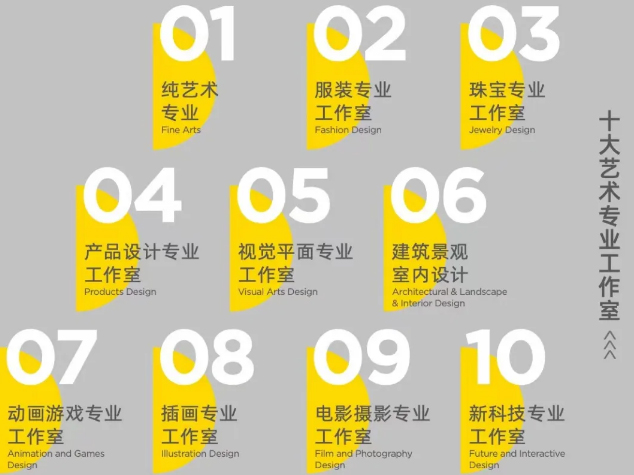 KAP共有十大艺术专业工作室,包括纯艺术专业工作室、服装专业工作室、珠宝专业工作室、产品设计专业工作室、视觉平面专业工作室、建筑景观室内设计工作室、动画游戏专业工作室、插画专业工作室、电影摄影专业工作室以及新科技专业工作室。