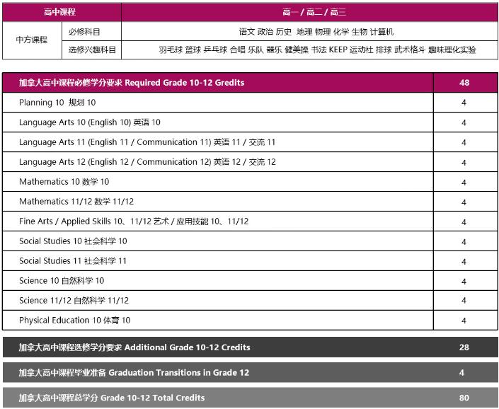 ·学生必须修满80个学分才能获得BC省的高中毕业证书(the Dogwood Diploma),80个学分中包括必修课程、选修课程和12年级的毕业过渡课程。
