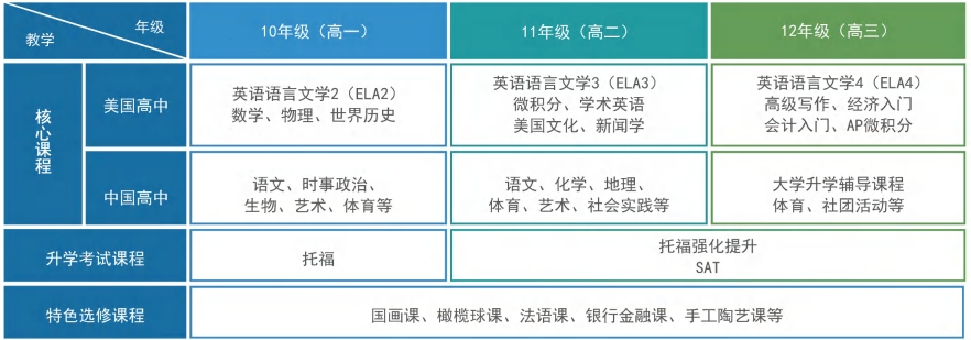 国际部课程将美国高中核心课程及国内高中课程与校本课程有机融合。美国高中课程由具备丰富教学经验的欧美籍外教执教,国内高中课程由本校选派优秀的教师授课。