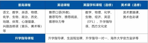 (1)基础课程:中学课程(International General Certificate of Secondary Education,简称IGCSE),为核心课程(A-Level)的预备课程。该课程学制一年,招收优秀的应届初中毕业生和高一年级在读生。考生必须通过入学考试,初中毕业生要求中考成绩达到重点高中分数线。