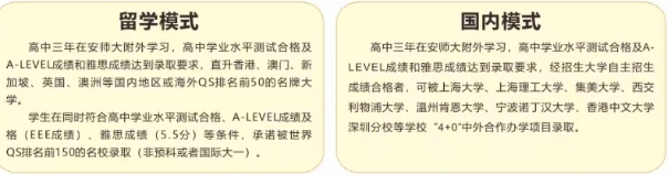 安徽师范大学附属外国学校“英高A-level精英班”的学生,采取必修国内高中课程及雅思英语课程+选修英国A-LEVEL课程的混合制体系授课,助力学生冲刺“英国G5及王曼爱华大学”,同时覆盖澳大利亚、加拿大、新加坡、香港等国家和地区排名前10名校。