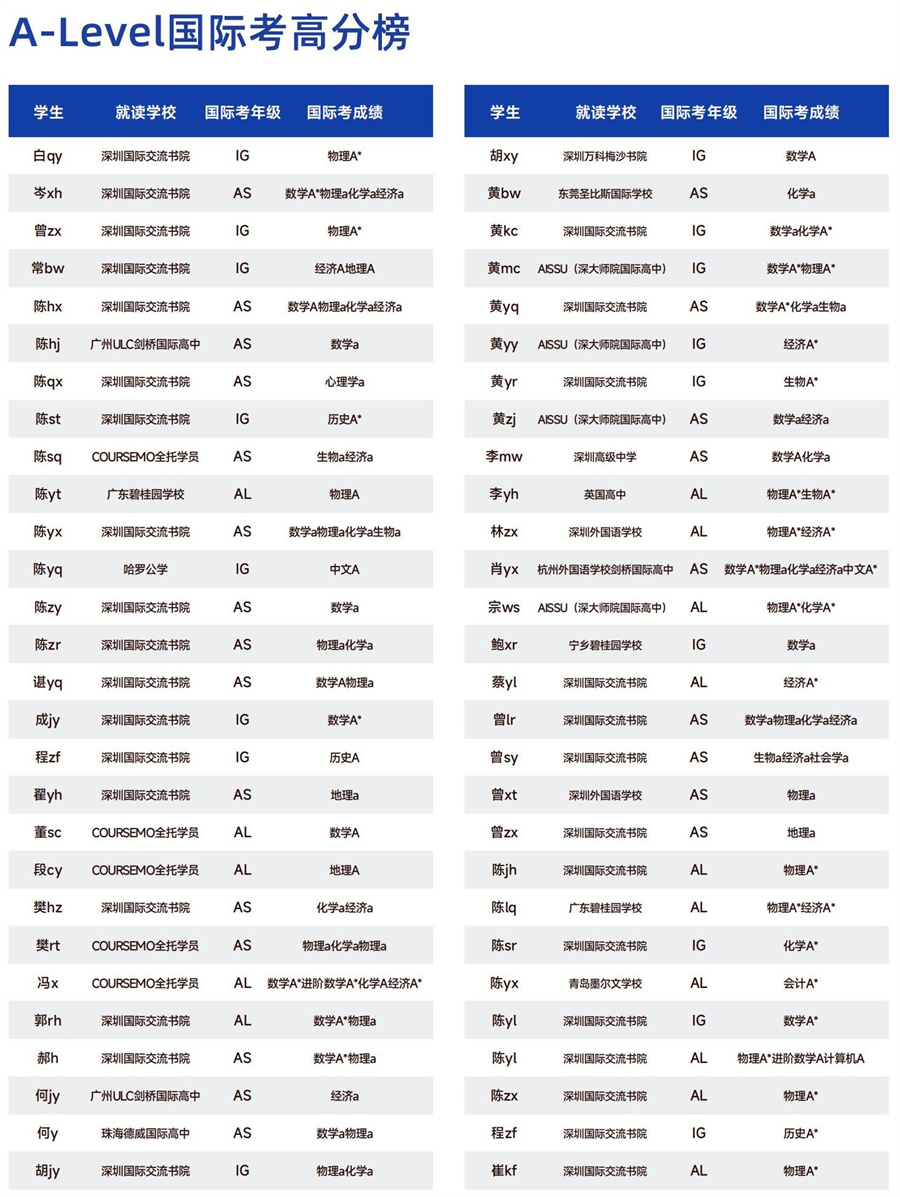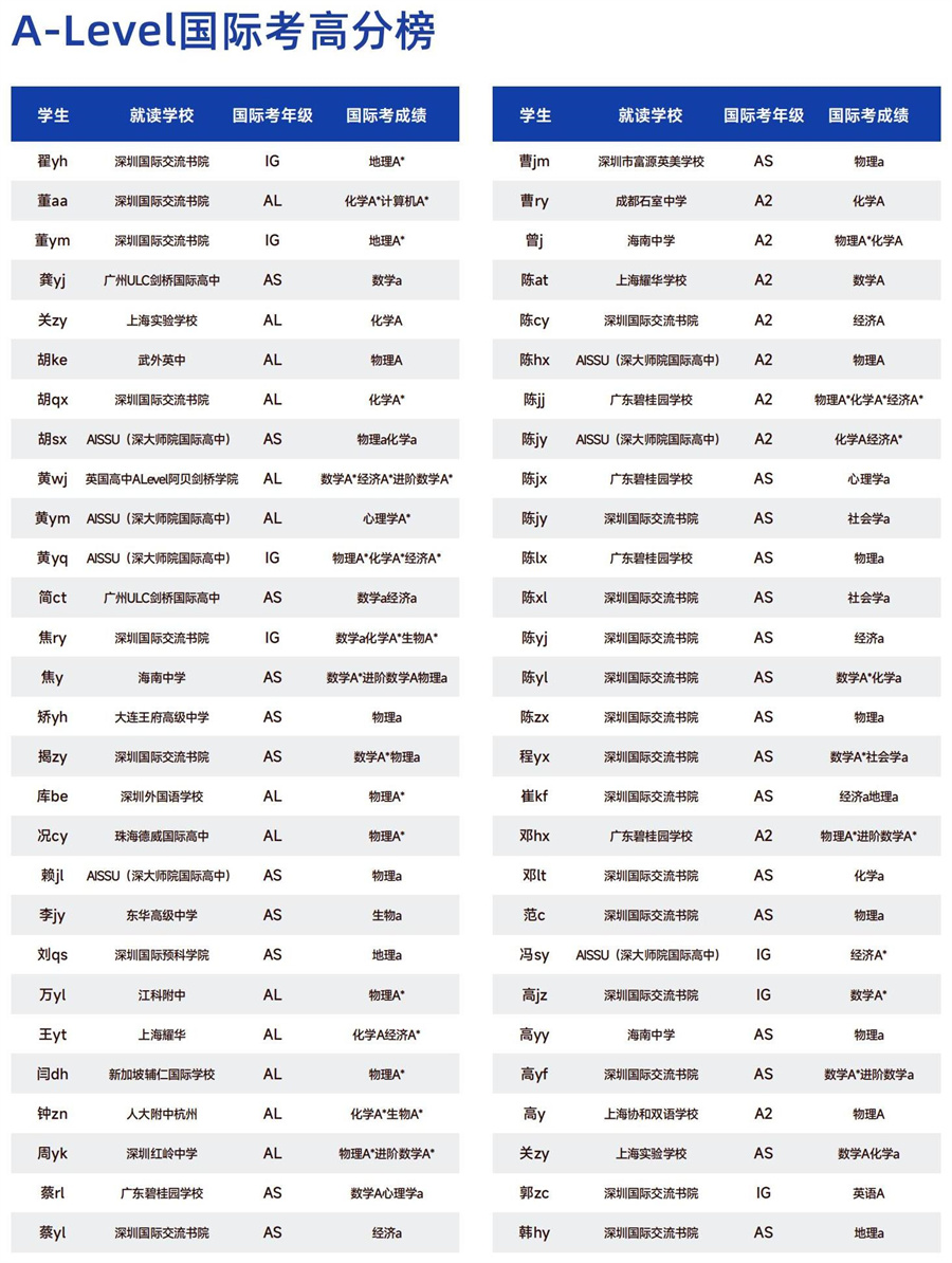 五、A-Level国际考高分榜(部分)