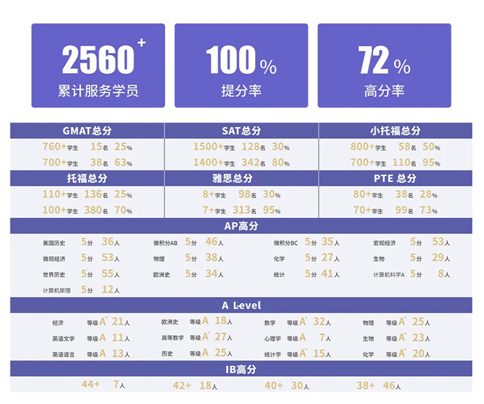 寰宇累计服务学员2560+,100%提分率,72%高分率。