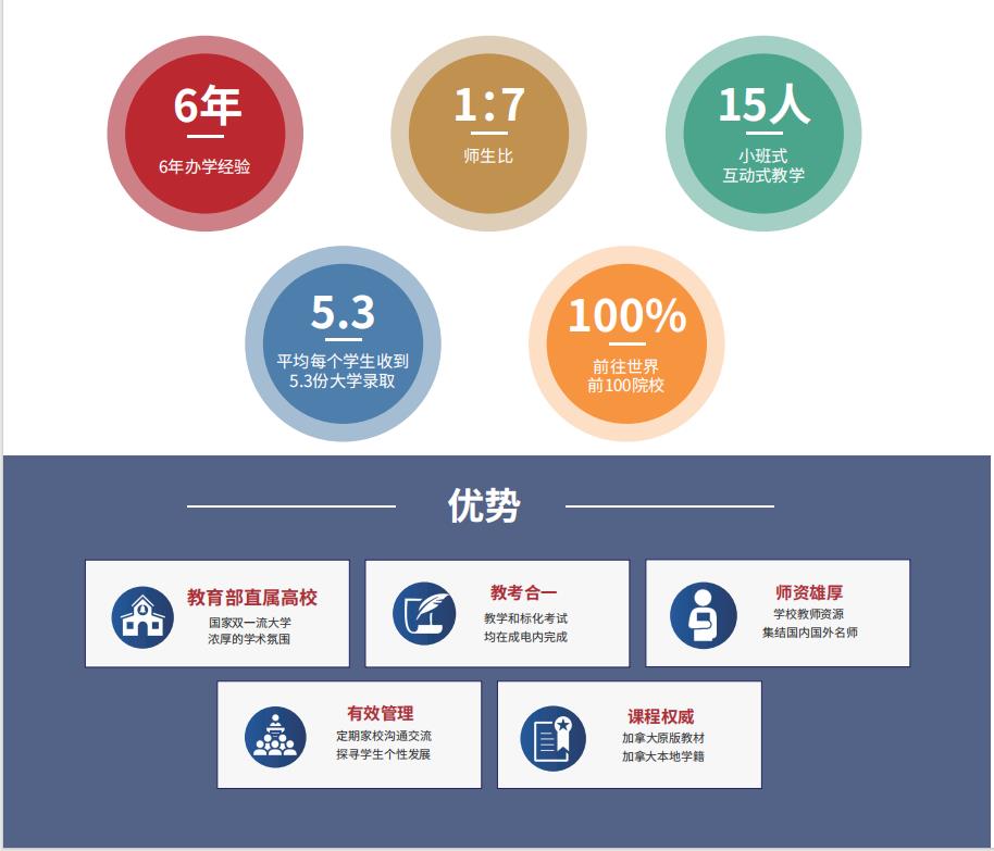 历届毕业生:65%世界排名前50名校、100%世界排名前100名校。是西南地区第一所由教育部直属双一流高校引进并推广,课程项目开办至今,所有学生均实现了“中”进“高”出,实现了真正的蜕变。