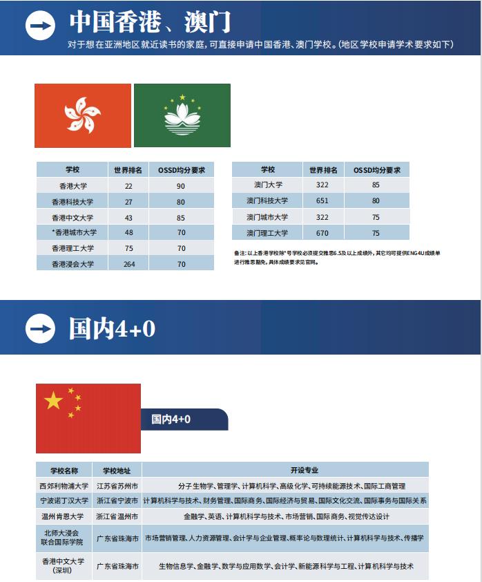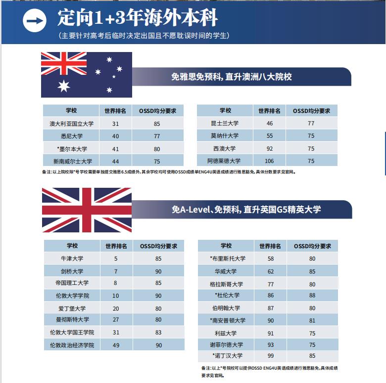 申请要求:用6门课程平均成绩,直接申请美、加、英、澳、新加坡、欧洲其他国家、中国港澳等全球名校。
