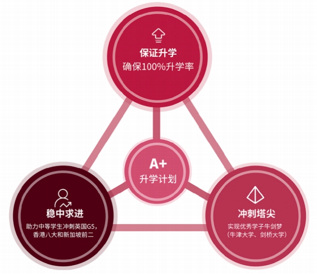 为满足多样化的升学需求和目标,国际书院专门为在校国际方向的学子打造了“A+升学计划”,针对不同学习基础的学生制定专属的升学辅导,并分为保底、稳中、冲高三个阶段。该计划旨在进一步提升升学质量,让每位学生都能申请到目标院校。