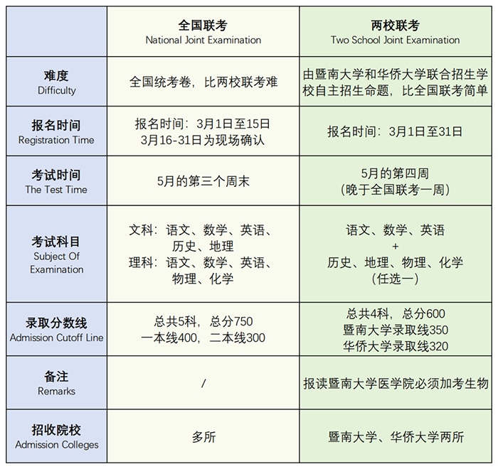 ▶两校联考指的是暨南大学、华侨大学联合招收港澳台、海外华侨极其他外籍学生的考试,类似于自主招生,学校自主命题。