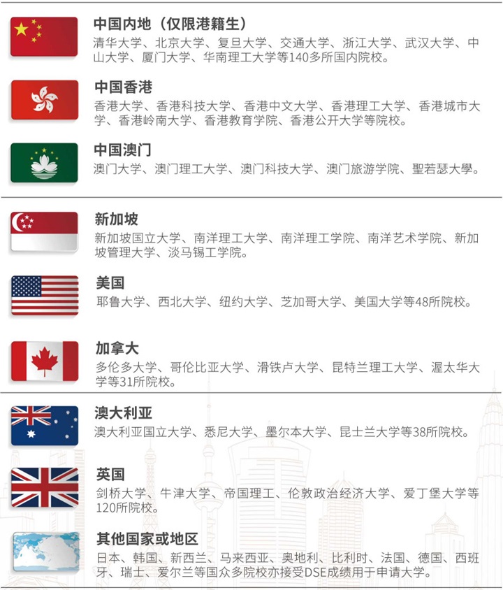 成绩受全球17个国家近300所院校认可,持有回乡证的港籍学生还可凭DSE成绩报读国内140多所著名高校。