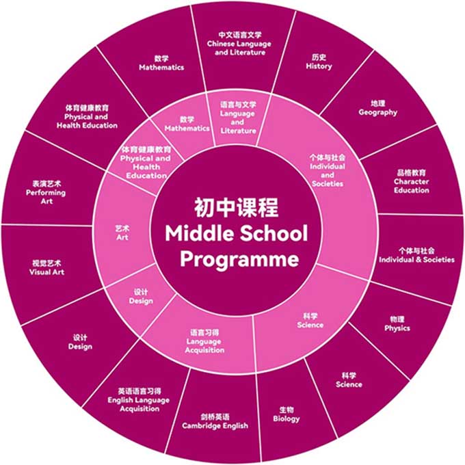 初中部以国家义务教育课程为基础,以国际文凭组织中学项目为框架,打造了一套融通中外的课程体系。国家义务教育课程开足开齐,以双语授课为主;各类拓展课程丰富多样。中西方教育思想通过六大教学方法得以融会贯通,形成了独具特色的双语教育。我们通过探究、行动、反思的探究循环,培养学生十项学习方法技能,让学生在双语环境中学会如何高效地学习,成为知行合一的终身学习者。通过多模态评估和跨学科项目学习,为将来的高中学习打下基础,为各类本地和国际考试做好准备,成为具有国际视野的中华文明传承者。