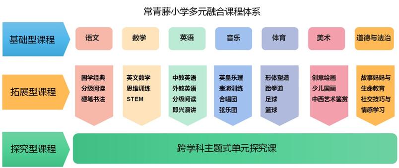 常青藤小学的课程以上海市二期课改课标为总纲,融合IB课程的先进教育理念,由中外教育顾问、专家精心设计而成。常青藤在实施国家和地方课程的基础上,借鉴国内外先进的教育理念和教学方法,夯实基础性课程,丰富拓展型课程,积极探索研究型课程。