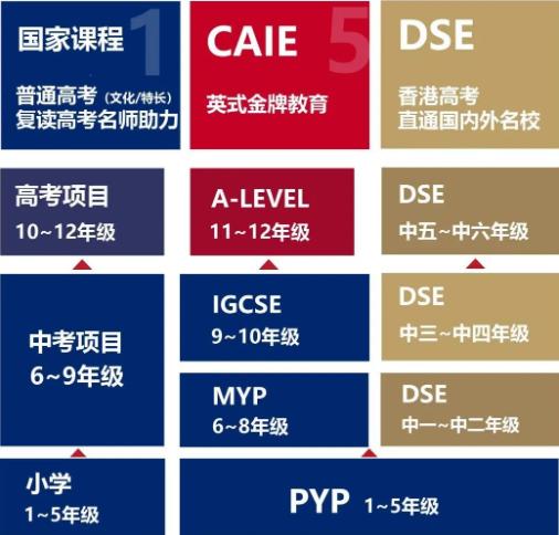 小学实施PYP项目课程和国家义务教育课程;初中实施MYP项目课程、香港DSE课程和国家义务教育课程;高中部开设IGCSE、A-LEVEL、香港DSE和国内高考课程课程。充分满足每一位学生个性及特点优势,助力学子直达世界名校。