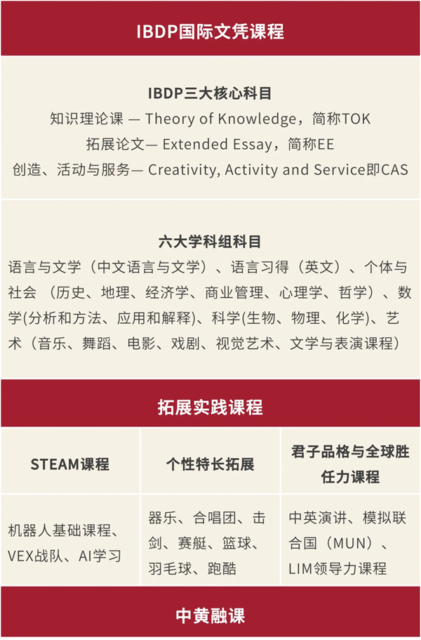 学校提供小学、初中、高中12年一贯制国际教育,基于中黄教育集团二十年中西融合全人教育积淀,打造大湾区最具探索性、前瞻性的中西融合课程体系,在两文三语的授课语境下,以香港课程为框架,融入IB国际文凭教育特色及中黄独特的中华文化学习体系,培养学生的君子品格与全球胜任力。