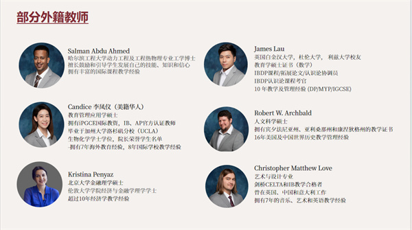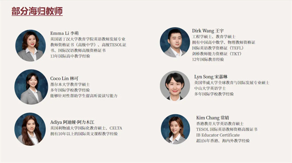 教师团队由港籍、外籍、海归及国内一流高校毕业教师组成,教师质量高。教师队伍中,外教比例达到30%以上,硕士以上学历比例达到85%以上,受过海外高等教育的教师比例超过90%,学校另有一批精通香港课程的专家顾问团队,为学生提供无缝衔接内地、港澳和国际的优质教育。
