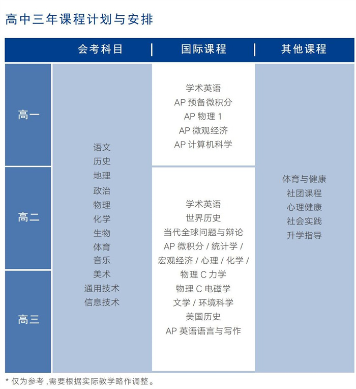 学术英语(托福)、SAT课程(选修)、AP课程(选修):微观/宏观经济、预备微积分、微积分BC、物理1、物理C、计算机、心理、文学、化学、统计学等。