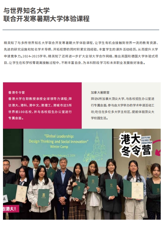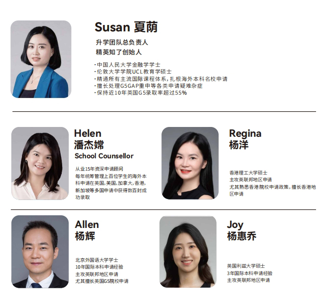 精英知了国际书院拥有一流的海外升学指导团队,包括牛剑外籍专家团队,并与全球50多所顶尖大学,建立申请绿色通道,成功帮助超过400多名学子,进入英、美、加、澳、香港、新加坡等地的顶尖学府。