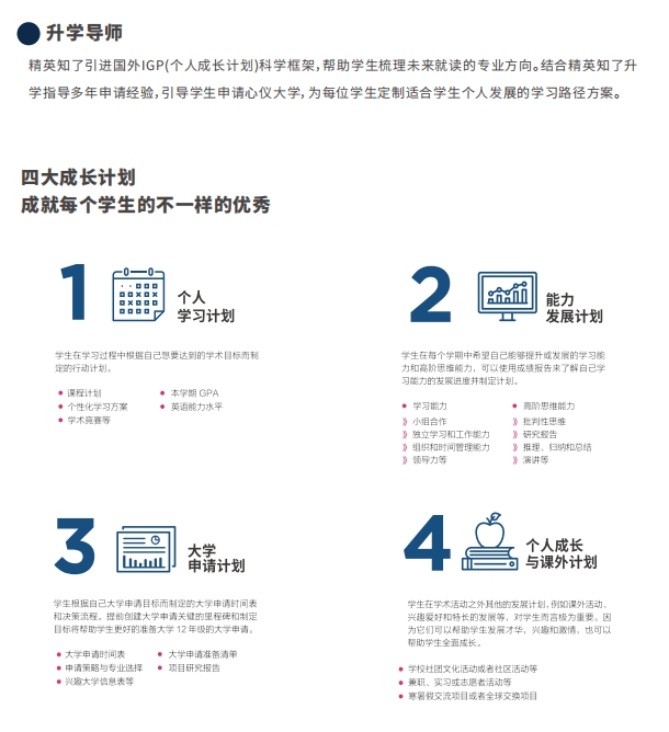精英知了OSSD项目的每一位学生,入学即配备专属专属升学指导老师,实施个性化的成长指导。指导学生完成选课,课程规划,专业测评,活动安排,申请材料准备,申请递交等一系列指导工作。为每一位学生的大学申请及未来发展保驾护航。