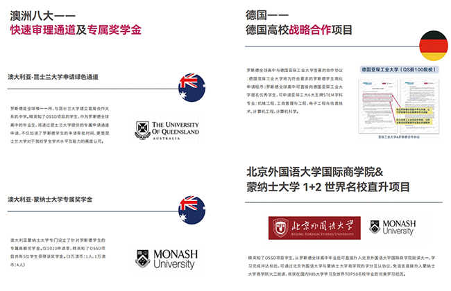 一直以来,凭借良好的学术声誉和毕业生质量,罗斯德全球高中与多所世界顶尖大学保持着紧密联系,并不断通过校际间合作,共同探索学生成长道路上的各种可能性,帮助他们实现从高中到高等教育的过渡。得益于这些大学合作,罗斯德全球高中学生将有机会直接与顶尖大学建立联系,从申请竞争力提升、到升学规划指导,再到升学路径保障,获得来自罗斯德全方位的支持。
