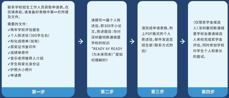 学校提供丰厚的艺术奖学金,只为寻找优秀的你!奖学金会以学生在曼彻斯通受教育阶段发放,以下为奖学金申请流程: