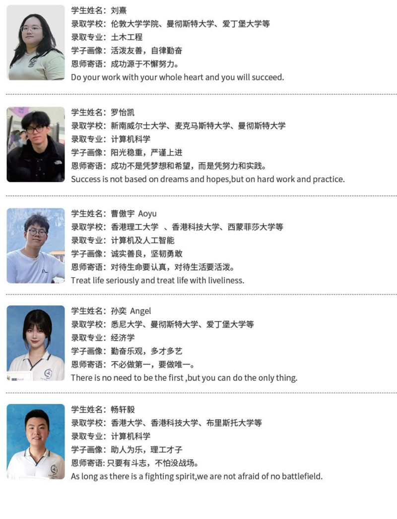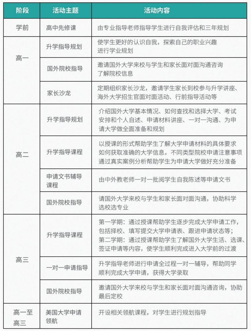 师达国际部有一支经验丰富的升学指导团队,平均从事升学指导工作8年以上,帮助上千名学生做升学指导规划。升学指导老师为学生提供一站式服务,包含留学时间规划、活动设计、考试规划、文书指导、学校申请、跟踪申请结果、签证办理、行前指导等。申请的大学分布在英国、澳洲、加拿大、美国、爱尔兰、新西兰、香港、新加坡等多个国家和地区。90%的学生被世界排名前100的大学录取,包括英国G5,澳洲八大、香港前三的大学。师达与200多所海外大学建立合作关系,定期会邀请海外大学招生官到校为学生进行讲座,组织国际教育展活动,让学生们多维度了解大学的专业信息和录取要求,为升学做充足的准备。