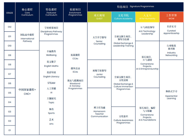 核心课程包括国家课程,未来衔接国际高中课程,旨在帮助学生打下坚实的学术基础,发展优秀的双语双文能力,无缝衔接海外大学升学;