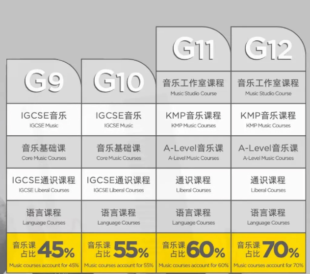 我们在九年级和十年级开设了 IGCSE 音乐课、音乐基础课和IGCSE 通识课程,十一年级和十二年级开设了音乐工作室课程、KMP特色音乐课程和通识课程,并在四个年级都搭建了完善的语言课程学习体系,帮助学生语言和专业全面发展。