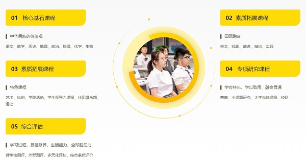为满足学生多样化需求,学校开设有器乐、美术、球类、棋类、科创类等辅助课程;利用国际化教学资源优势,开设外教口语、戏剧、外教体育、音乐、ESL等特色课程。组织哈佛辩论赛、学长面对面、暑期衔接营、模拟联合国、凯文艺术营、戈壁之旅、国际日、艺术节、体育节等社团与节庆活动,在周末开设实践活动类、学科拓展类、校队竞技类课程,定期组织学生进行野外生存训练、博物馆探索、职业体验、公益服务等社会实践活动,帮助学生夯实基础、拓展视野、学会探究,在丰富多彩的活动中陶冶情操获得成长。