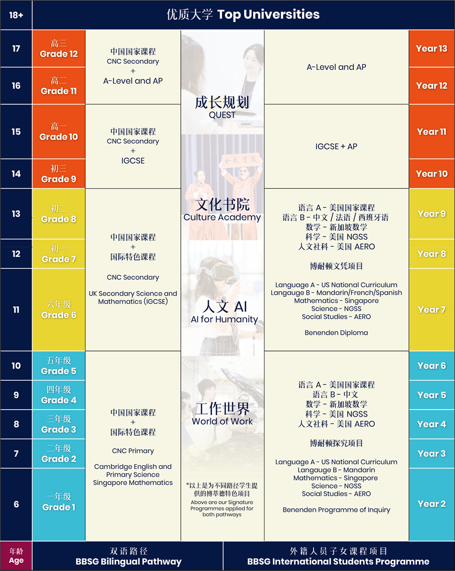 博萃德高中部的学术课程体系将有机融合多项课程体系,包括备受全球大学认可的IGCSE(英国国际中学教育)课程、A Level(英国国际中学教育高等水平)课程,以及中国国家课程和Pre-AP课程(美国大学先修课程的过渡性课程),为学生未来升学全球顶尖院校打下坚实的学术基础。