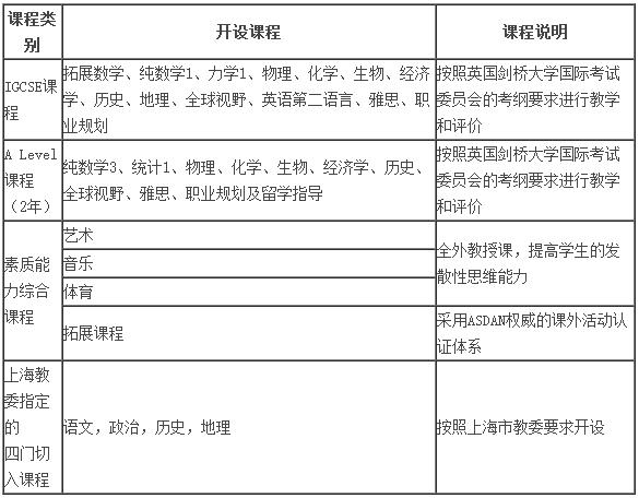 高中阶段:上海金苹果双语学校剑桥IGCSE和A-Level课程开设的课程有数学、进阶数学、物理、化学、生物、历史、经济、地理、英语第二语言、英语第一语言、批判思维、全球展望、升学指导等课程,剑桥IGCSE课程提供70几门课程,剑桥A-Level课程提供50几门课程以供学生选择。