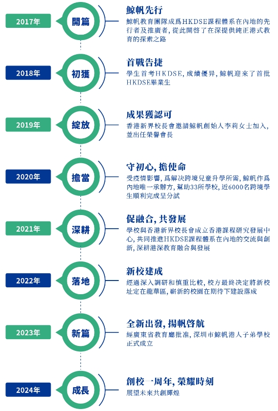 深圳市鲸帆港人子弟学校在办学过程中不断推进深圳地区纯正的港式教育,致力于发展适应时代需求的全新课程体系,开辟国际课程领域的新赛道。至今,学校已硕果累累,学生们成功考入海内外知名高校,实现学术理想,踏上人生新台阶。