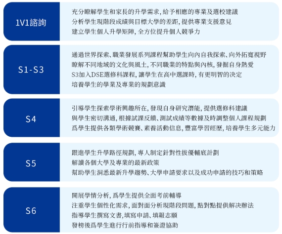学校为学生和家长提供一系列升学讲座和活动。学校不定期邀请香港及国内外知名大学的招生官到校进行宣讲,帮助学生和家长近距离了解名校的文化和优势。同时,学校通过多种渠道及时传递 HKDSE 及各大名校的最新数据和动态,以缩小信息差距,帮助家长更精准地为学生规划升学方向。