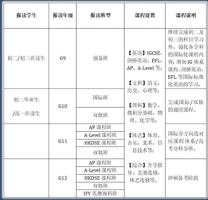 香江国际部作为大湾区第一批国际化教育先锋学校,以“多元升学”为基调,不断探索融合中西方优势的课程体系,目前已开设AP课程、AP顶石课程、IGCSE课程、A-Level课程、HKDSE课程、IFY英澳预科课程以及普高国际双轨课程,成为课程国际化、升学多元化、综合实力强的优秀国际化学校代表。
