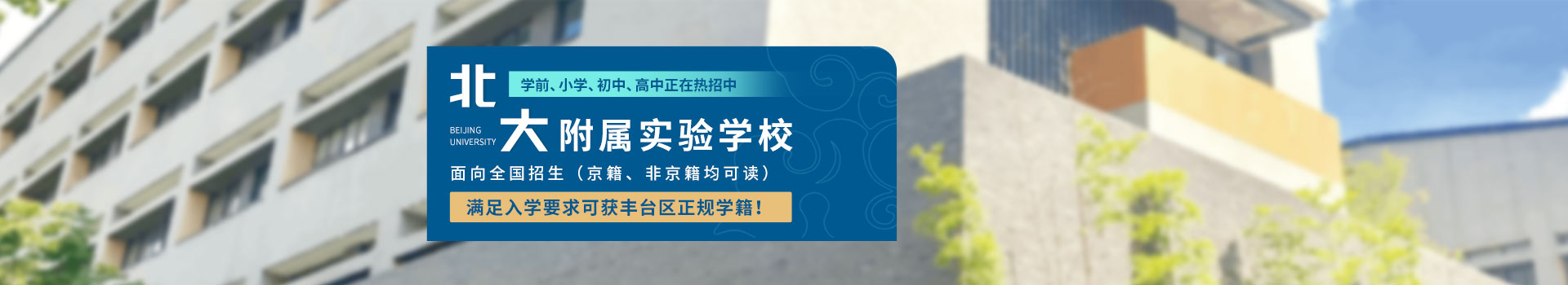 北大附属实验学校简介 百年北大,十六年附校,北大附属实验学校,是经北京大学和北京市教委批准成立,集学前,小学,初中,高中为一体的现代化全日制寄宿学校,学校坐落在风景秀丽的北京市一级公园“中华文化园”的东侧,基础设施齐全,教学设备先进,校园环境整洁,学习氛围浓厚。学校依托北京大学,共享北京大学的优质教育资源,秉承北京大学“爱国、进步、民主、科学”的光荣传统,多年来坚持回归教育本质,快乐学习,健康成长